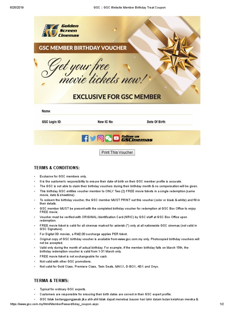 Gsc Cinemas Free 2 Movie Tickets During Your Birthday Month Sign Up As Website Member For Free To Print Birthday Treat Coupon