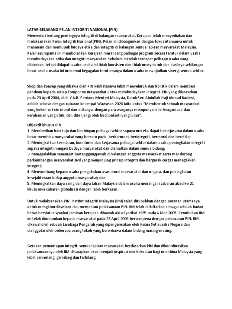 Sumber Institut Integriti Malaysia Pelan Integriti Nasional